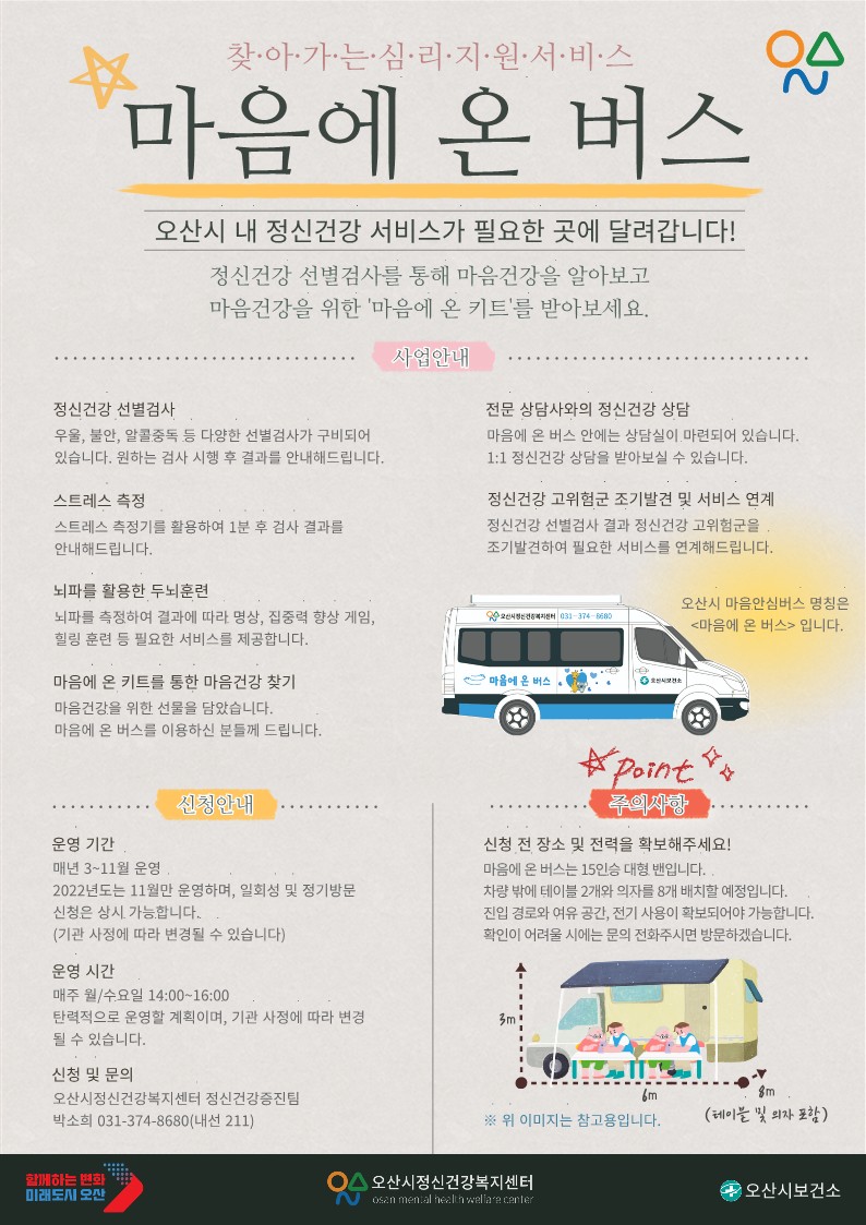 '마음에 온 버스'는 오산시민들에게 정신건강 선별검사와 스트레스 척도검사, 두뇌치유 훈련, 고위험군 발굴 및 상담 등의 서비스를 제공합니다.