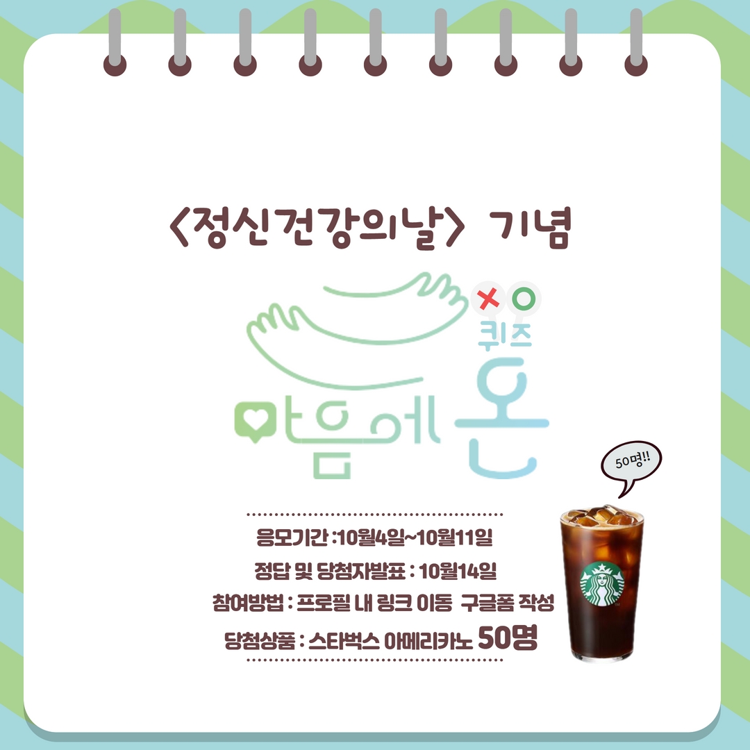 안녕하세요! 오산시정신건강복지센터입니다~ 정신건강의날 기념! 마음에 온 퀴즈가 돌아왔습니다~ 오래 기다리셨나요? 오래 기다리신 만큼 많이~ 상품을 준비했습니다! 퀴즈 맞추시고 스타벅스 아메리카노 키프티콘 받아가세요!